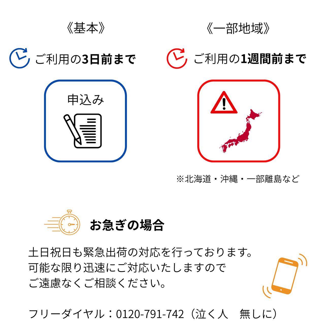 確実にご利用いただくため、基本的に「ご利用日の3日前まで」のお申し込みをお願いしております。